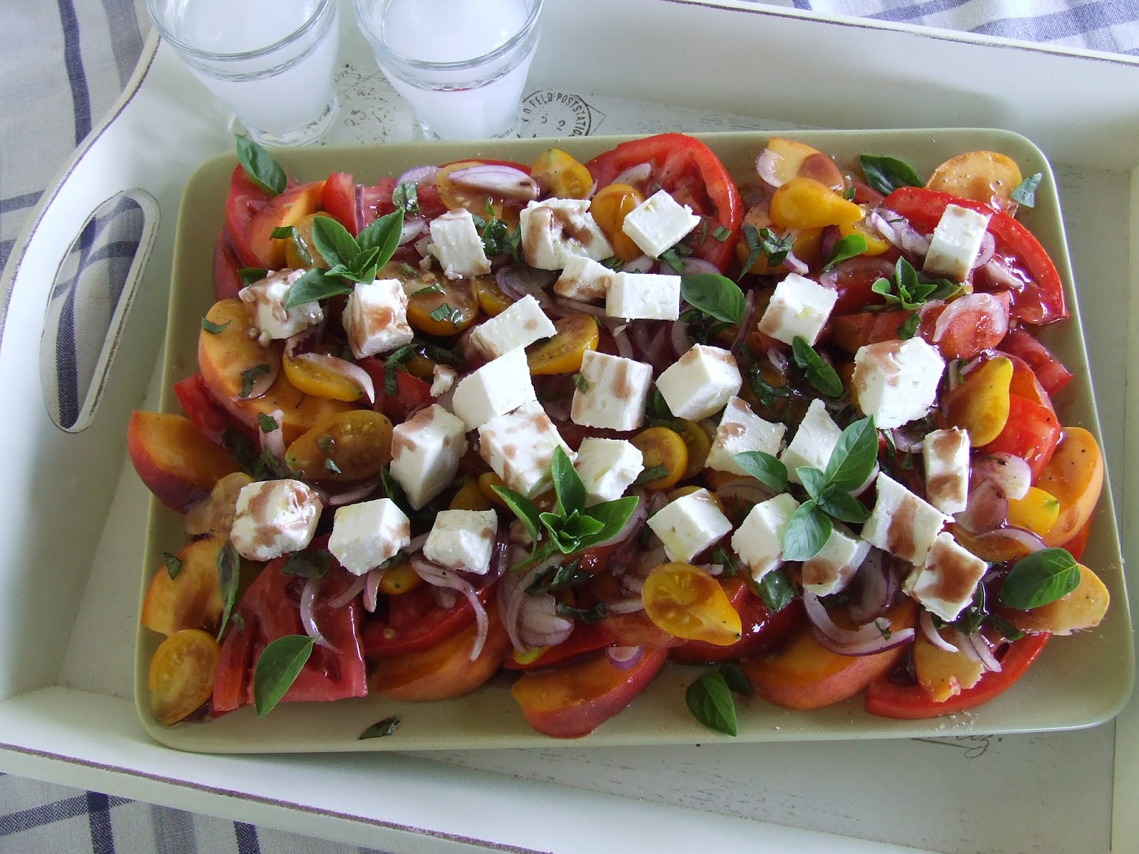 Breskve, paradajz i luk isecite na kriške, sir na